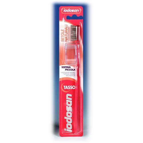 Spazzolino morbido con setole naturali di tasso. Iodosan Tasso ha una testina piccola per raggiungere meglio tutti gli angoli della bocca.