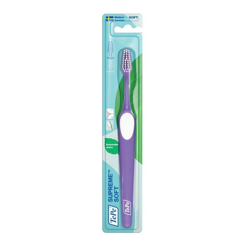 TePe Supreme Le setole hanno i filamenti con un design innovativo a due livelli. I filamenti più lunghi puliscono meglio negli spazi interdentali e lungo la linea gengivale, mentre quelli più corti detergono efficientemente la superficie dentale. Testina conica e manico antiscivolo.