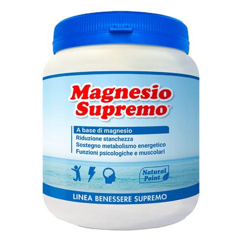 Magnesio Supremo, marchio registrato di Natural Point, è un integratore alimentare di magnesio, minerale utile per contrastare stanchezza e affaticamento specialmente nei periodi di maggiore stress psico-fisico. Il magnesio inoltre sostiene il fisiologico funzionamento della muscolatura e del sistema nervoso.