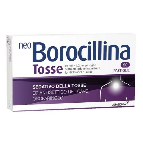 In caso di tosse irritante con una notevole produzione di muco (ad es.nei pazienti affetti da patologie quali bronchiettasia e fibrosi cistica) oppure nei pazienti affetti da malattie neurologiche associate auna marcata riduzione del riflesso della tosse (come ictus, malattia di Parkinson e demenza), il trattamento con il farmaco come sedativo della tosse dovrebbe essere somministrato con particolare cautela e solosu consiglio medico dopo un'attenta valutazione del rischio-beneficio. Vi sono informazioni limitate sull'uso del destrometorfano nei pazienti con compromissione della funzionalita' epatica o renale. Pertanto,Neo Borocillina Tosse pastiglie deve essere somministrato con cautelain tali pazienti, specialmente nei pazienti con compromissione grave.Il destrometorfano e' metabolizzato dal citocromo epatico P450 2D6. L'attivita' di questo enzima e' geneticamente determinata. Circa il 10%della popolazione metabolizza lentamente il CYP2D6. In metabolizzatori lenti e pazienti con uso concomitante di inibitori del CYP2D6 possono manifestarsi effetti esagerati e/o prolungati del destrometorfano. E' necessario pertanto prestare attenzione in pazienti metabolizzatorilenti del CYP2D6 o che utilizzano inibitori del CYP2D6. A causa del potenziale rilascio di istamina, si dovrebbe evitare l'uso in caso di mastocitosi. Una tosse cronica puo' essere un sintomo precoce di asma equindi non e' indicato per la soppressione della tosse cronica, in particolare nei bambini. Usare con cautela nei pazienti che assumono farmaci serotoninergici (diversi dai farmaci inibitori delle MAO), quali inibitori selettivi della ricaptazione della serotonina (SSRI) (per es.fluoxetina, paroxetina) o farmaci antidepressivi triciclici. L'impiego, specie se prolungato, dei prodotti per uso topico puo' dare originea fenomeni di sensibilizzazione. In tal caso e' necessario interrompere il trattamento e consultare il medico ai fini della istituzione dieventuale terapia idonea. Dopo 5-7 giorni di trattamento, senza risultati apprezzabili, consultare il medico. Informazioni importanti su alcuni eccipienti Contiene 1,386 g di saccarosio (zucchero) per pastiglia. Da tenere in caso di considerazione in persone affette da diabete mellito. I pazienti affetti da rari problemi ereditari di intolleranza al fruttosio, da malassorbimento di glucosio-galattosio, o da insufficienza di sucrasi isomaltasi, non devono assumere questo medicinale. Ilprodotto contiene aspartame, fonte di fenilalanina. E' sconsigliabiledurante la terapia l'assunzione di alcool. Il destrometorfano puo' dare una modesta assuefazione. A seguito di un uso prolungato (per es. eccedendo il periodo di trattamento raccomandato), i pazienti possono sviluppare tolleranza al medicinale, cosi' come dipendenza mentale e fisica. Sono stati riportati casi di abuso di destrometorfano. Si raccomanda di prestare particolare attenzione con adolescenti e giovani adulti, nonche' con pazienti con una storia di abuso di farmaci o sostanzepsicoattive. I pazienti con tendenza all'abuso o alla dipendenza devono assumere il farmaco per brevi periodi e sotto stretto controllo delmedico.