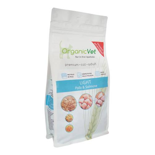 OrganicVet LIGTH pollo e salmone Alimento alimento secco naturale per gatti adulti con particolari esigenze. Pollo e salmone offrono i migliori sapori e una maggiore accettazione da parte del gatto. La formula bilanciata è straordinariamente piacevole e offre un'alta digeribilità. Ricco di omega3 e acidi grassi di omega6; contiene tutte le importanti vitamine e minerali necessari per una dieta sana e bilanciata. Tutti i componenti nutrizionali essenziali sono inclusi nella giusta proporzione. Evita la formazione di palle di pelo.