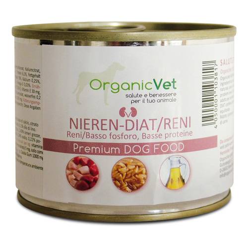 OrganicVet NIEREN-DIÄT Alimento umido per cane con un ridotto contenuto di fosforo, contenuto proteico rettificato, almeno il 50% di carne ad uso alimentare e uso di avanzi alimentari.